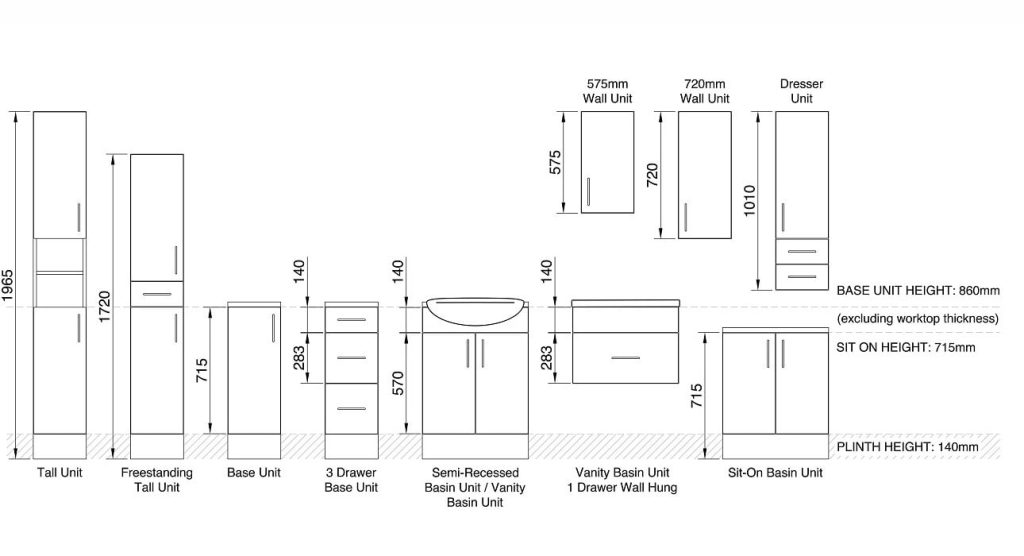 - Sit-on base units are 575mm high, adding a 140mm Plinth and 30mm Worktop, takes the total height to 745mm high.