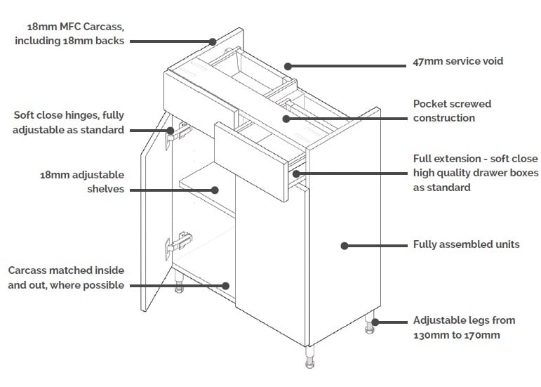 • All doors, drawers and fascias are easily removable in order to access your services, or to keep them safe during installation.