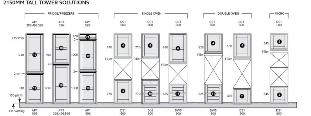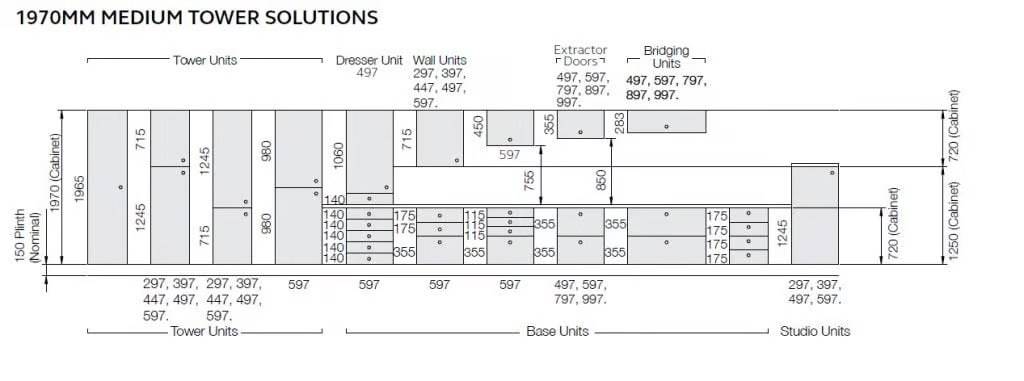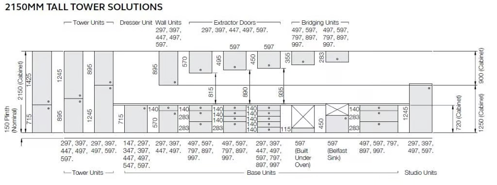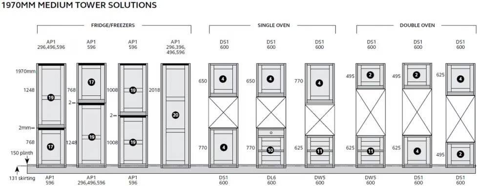 • Larder units are either 1970mm or 2150mm high, adding a 150mm Plinth, takes the total height to either 2120mm or 2300mm high.