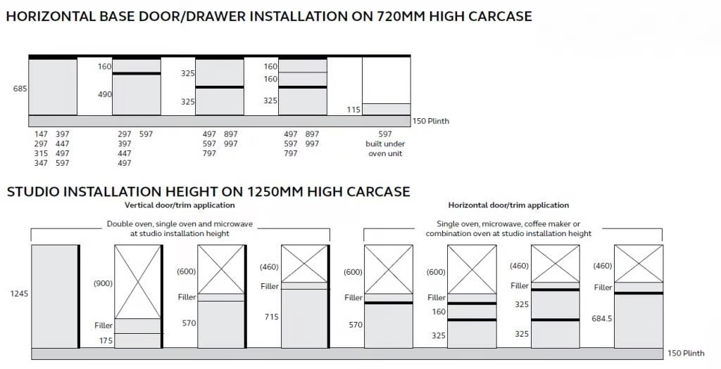 • Mid-Height units are 1295mm high, adding a 150mm Plinth and 40mm Worktop, takes the total height to 1485mm high.