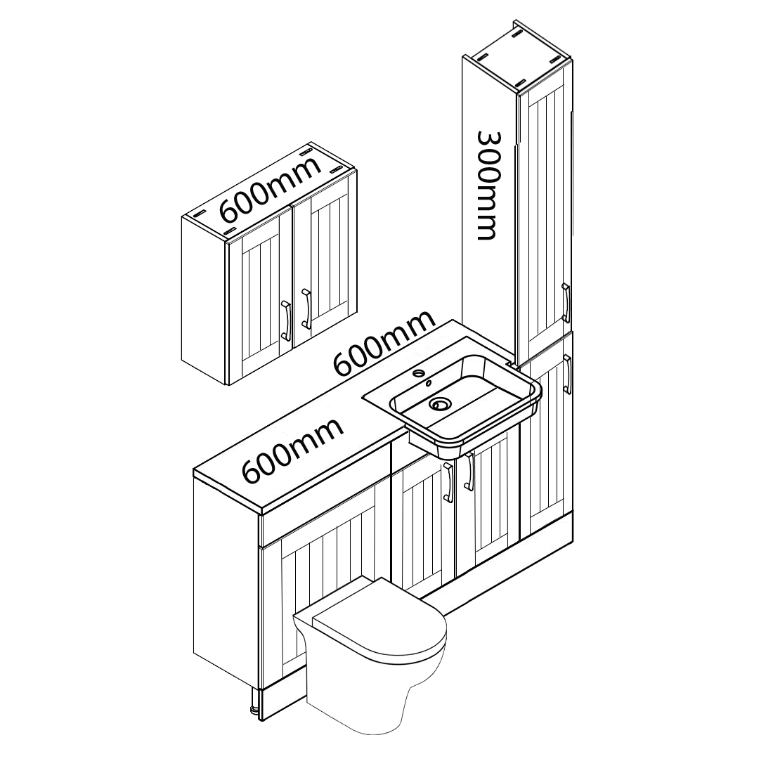 These units can be put into any order you like and not just as per the picture. You get the option of worktops, handles, toilet, basin and cistern.
