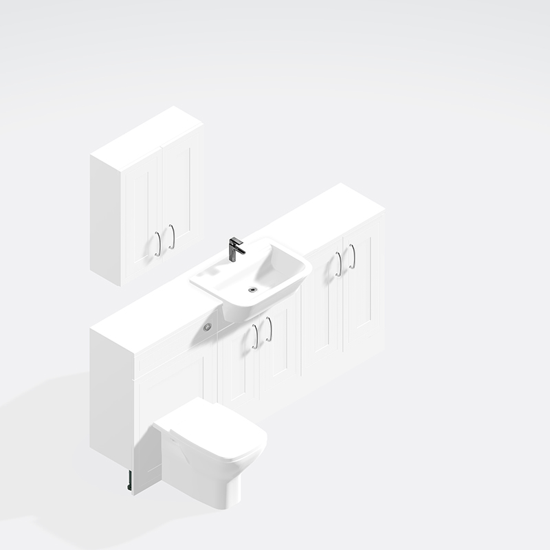 These units can be put into any order you like and not just as per the picture. You get the option of worktops, handles, toilet, basin and cistern.