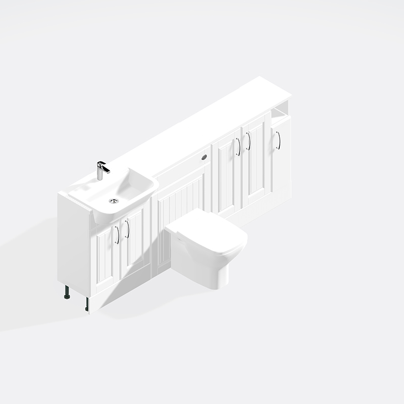 These units can be put into any order you like and not just as per the picture. You get the option of worktops, handles, toilet, basin and cistern.