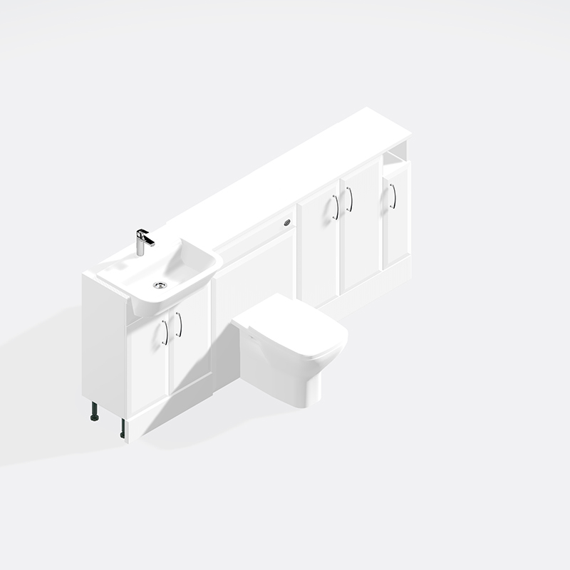 These units can be put into any order you like and not just as per the picture. You get the option of worktops, handles, toilet, basin and cistern.