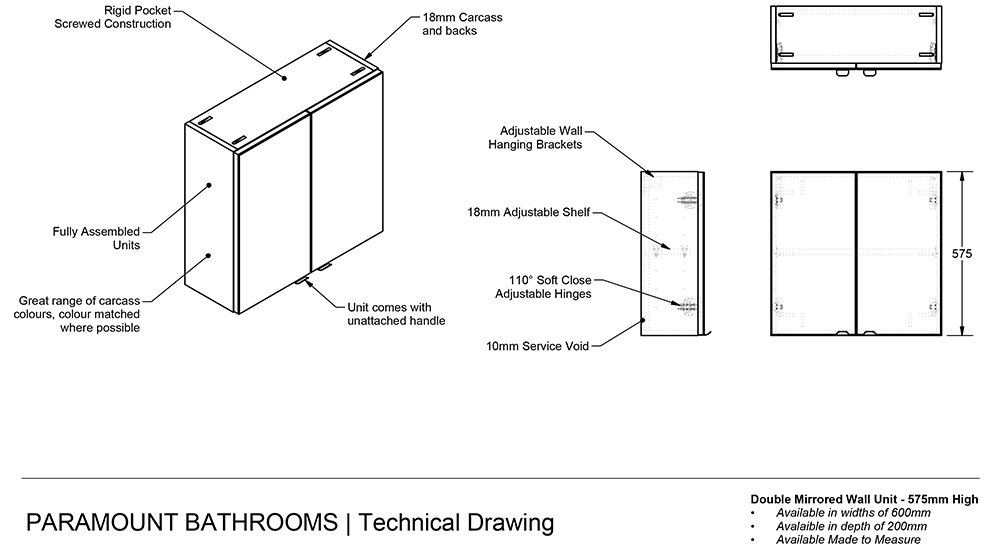 Bathroom 575mm High Single Mirrored Wall Unit - True Rail