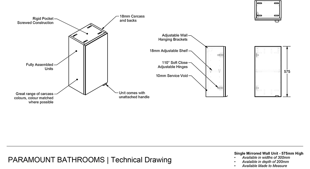 to 500mm, a height of 575mm and depths of 200mm and 270mm. The single door