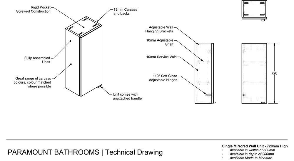to 500mm, a height of 720mm and depths of 200mm and 270mm. The single door