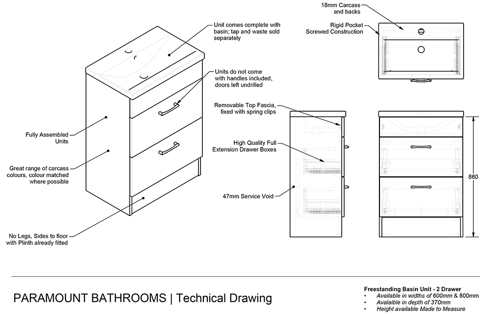 Freestanding Bathroom 2 Drawer Rear Tap Basin Unit - True Rail